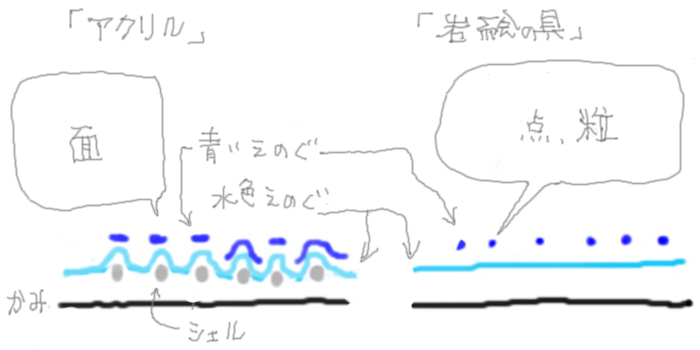 対するアクリル絵具は「ぬるっとしているから」。というように母国語を使いこなせない低脳な私には図を用いる知恵があったので図を用いて説明。