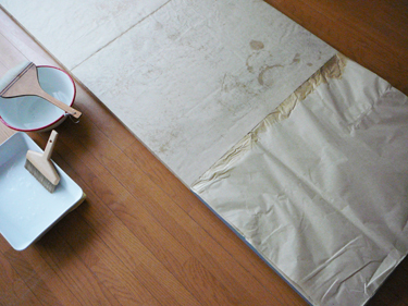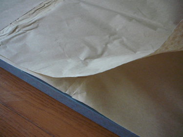べた貼りの糊が蓑貼りの茶ちり薄口に吸われてしまうとすぐに破れてしまうので、やり直しが利くようにあらかじめ蓑貼り部分には貼る分だけ水を刷毛で塗っておきます。これで何度かは、ずれの直しが出来るようになります。